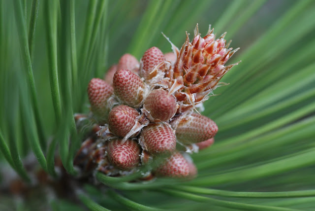 Ahora echemos un vistazo a las flores masculinas y femeninas de los pinos. Las estructuras parecidas a capullos que se ven debajo forman una inflorescencia masculina.